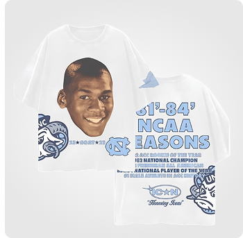 The Carolina Legacy Tee pays tribute to the early college years that shaped a basketball icon. Featuring clean Carolina blue graphics and archival-style typography, this piece captures the roots of greatness, from hardwood battles to NCAA glory.